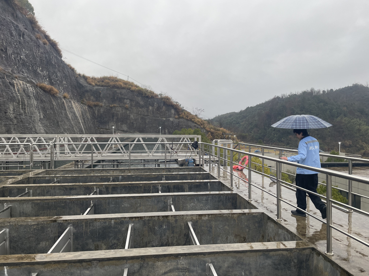 除夕傍晚,天灰蒙蒙的,雨下得正紧。汽车沿着盘山公路蜿蜒而上,雨刷飞快地摆动,车窗外的山色一片朦胧。记者抵达坐落于金华市武义县西联乡河涧村的柳城水厂时,水厂管理员宁智威正好向外迎来。
